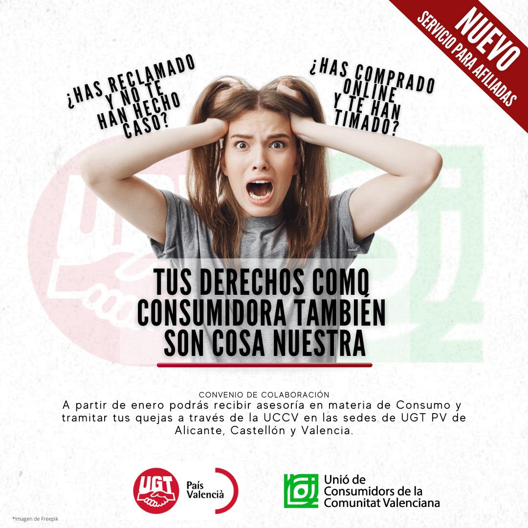 Fruit del conveni de col·laboració signat per UGT PV i la Unió de Consumidors de la Comunitat Valenciana, l’11 de gener s’iniciaran les atencions en la seu d’UGT PV a València.