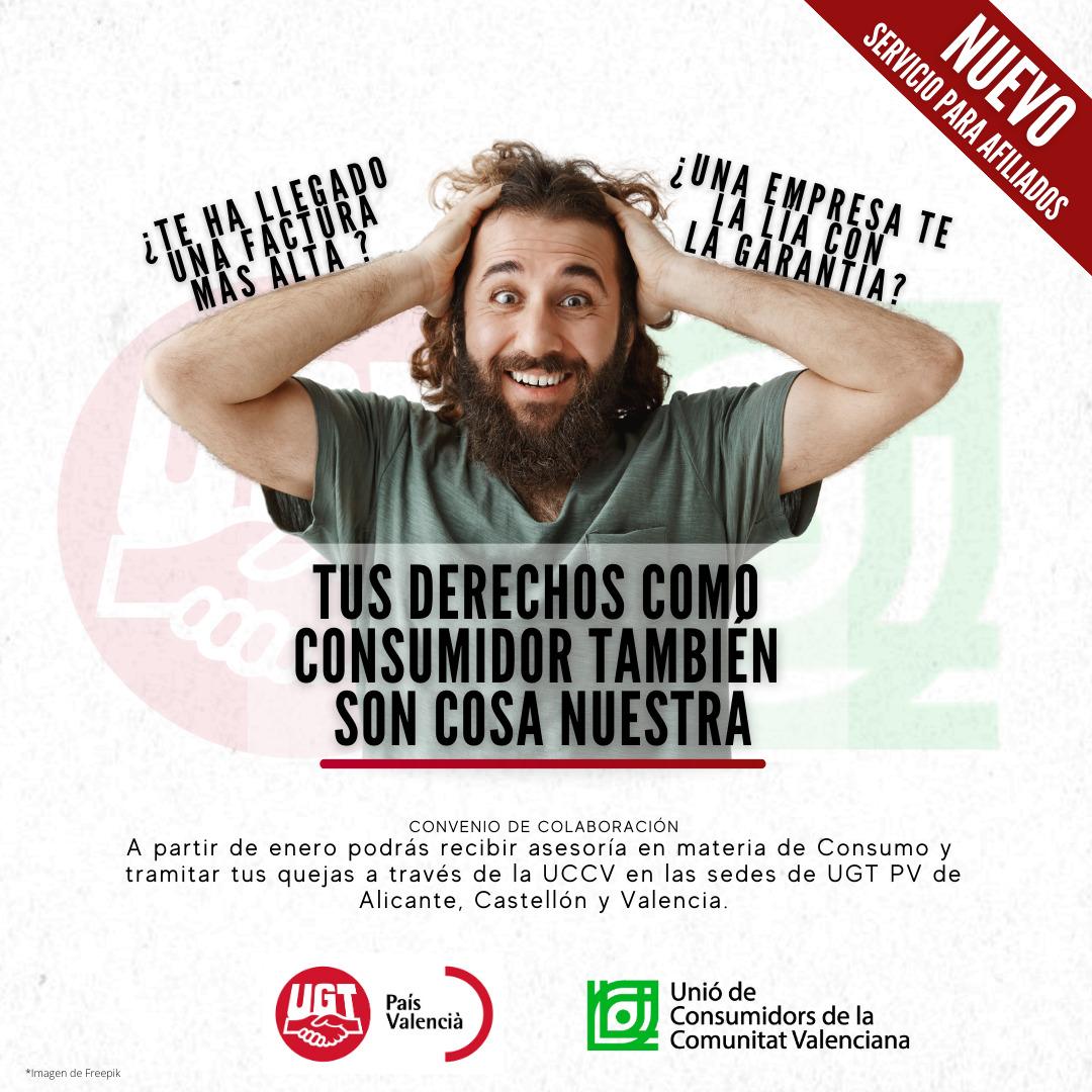 Fruto del convenio de colaboración firmado por UGT PV y la Unión de Consumidores de la Comunitat Valenciana, el 11 de enero se iniciarán las atenciones en la sede de UGT PV en València.