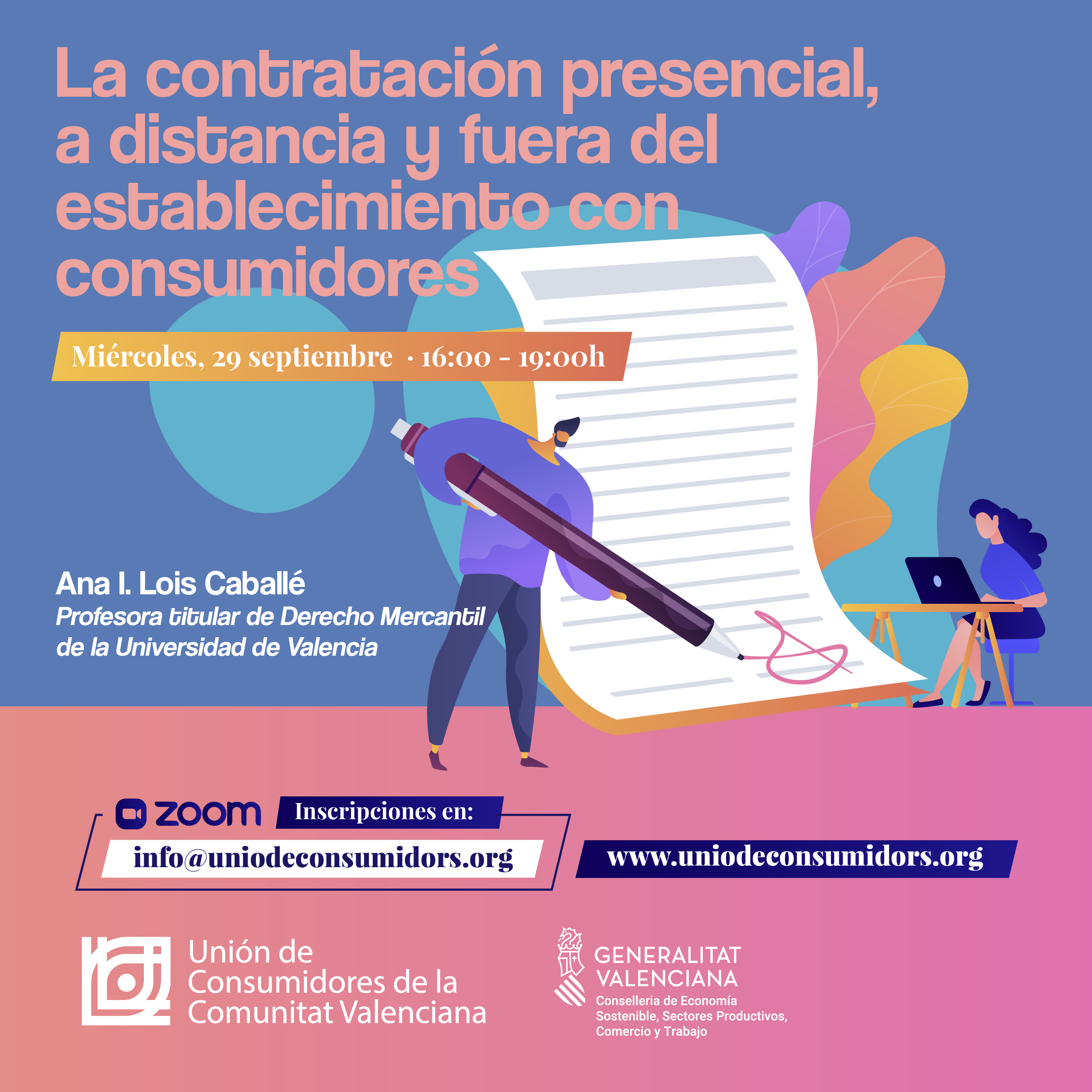 La Unión de Consumidores de la Comunitat Valenciana en colaboración con la Conselleria de Economía Sostenible, Sectores Productivos, Comercio y Trabajo organiza el próximo 29 de septiembre de 2021 a las 16h un webinar en el que se abordará la contratación de servicios tanto en formato presencial como a distancia y fuera del establecimiento con consumidores que estará impartido por Ana I. Los Caballé, profesora titular de Derecho Mercantil de la Universitat de València.