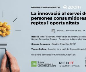 La Unió de Consumidors de la Comunitat Valenciana en col·laboració amb REDIT hem organitzat dijous, 22 d'octubre a les 16:00h una jornada digital en la qual abordarem els reptes i oportunitats que ofereix la innovació al servei de les persones